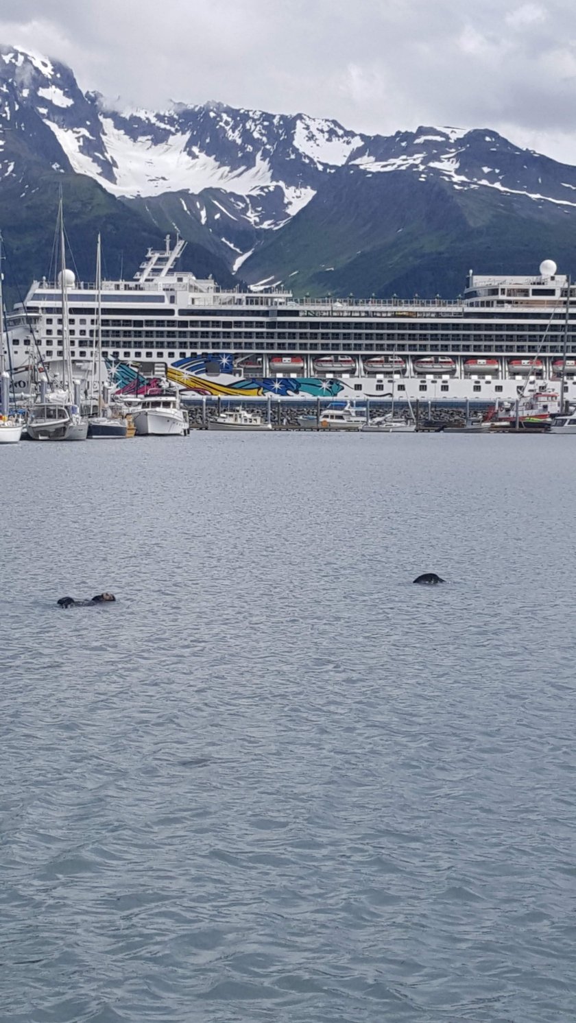 Cute otters playing in the harbour. With the Norwegian Jewel in the background with mountain backdrop.