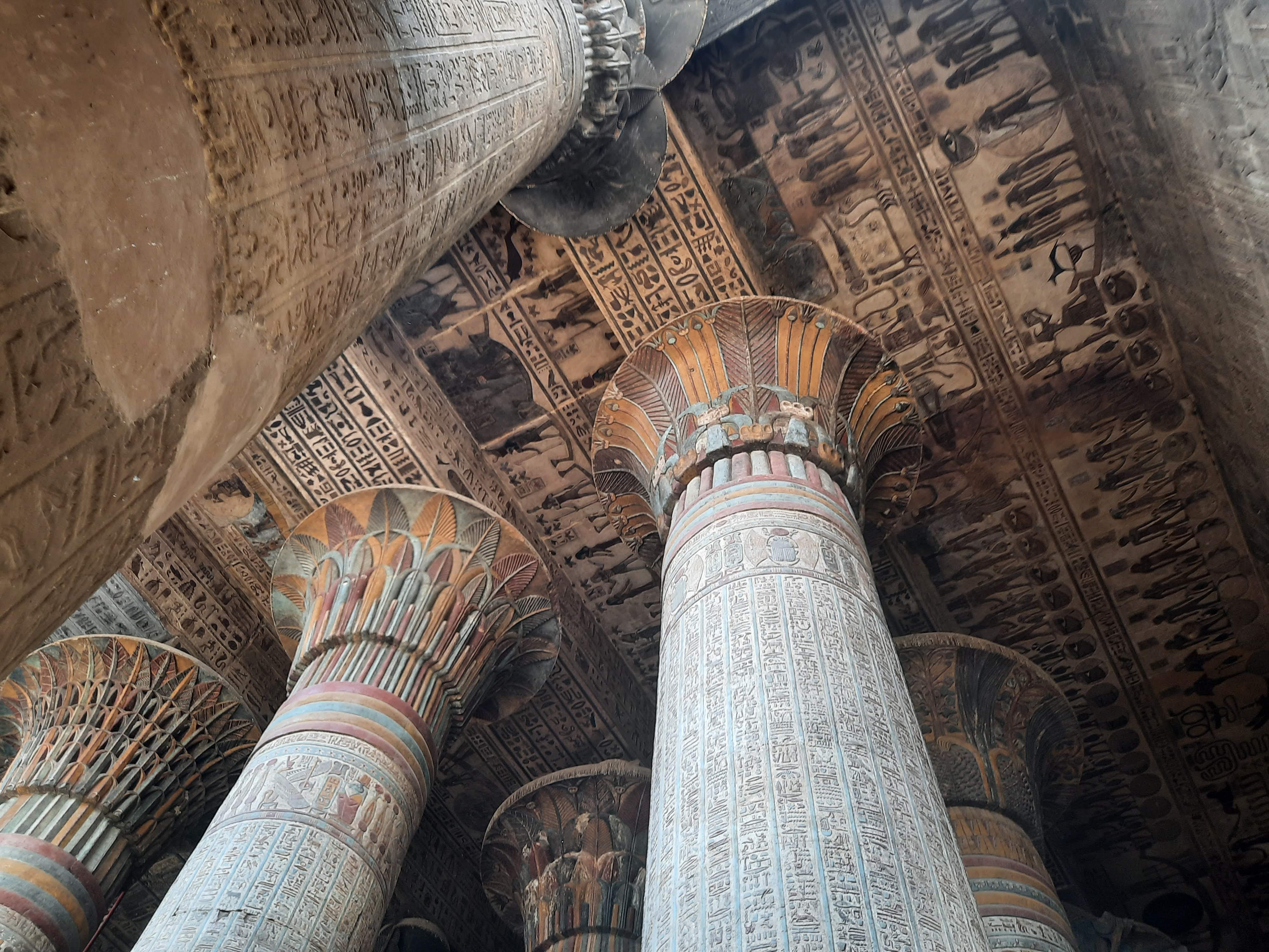 The temples of Esna were under mud for 3000 years. Fascinating how a city was built on top of this historical ruins. They were discovered 200 years ago and archaeologists are still uncovering treasures. Houses built on top of the ruins are slowly being acquired and people are being relocated. A bit like how people in Sydney have had their homes purchased by the government to build roads or airports. It is amazing how this workmanship has lasted 3 millenia and the colours, although faded, are still very visible. How have the colours of the work lasted so long!